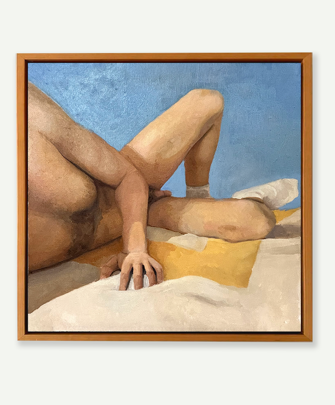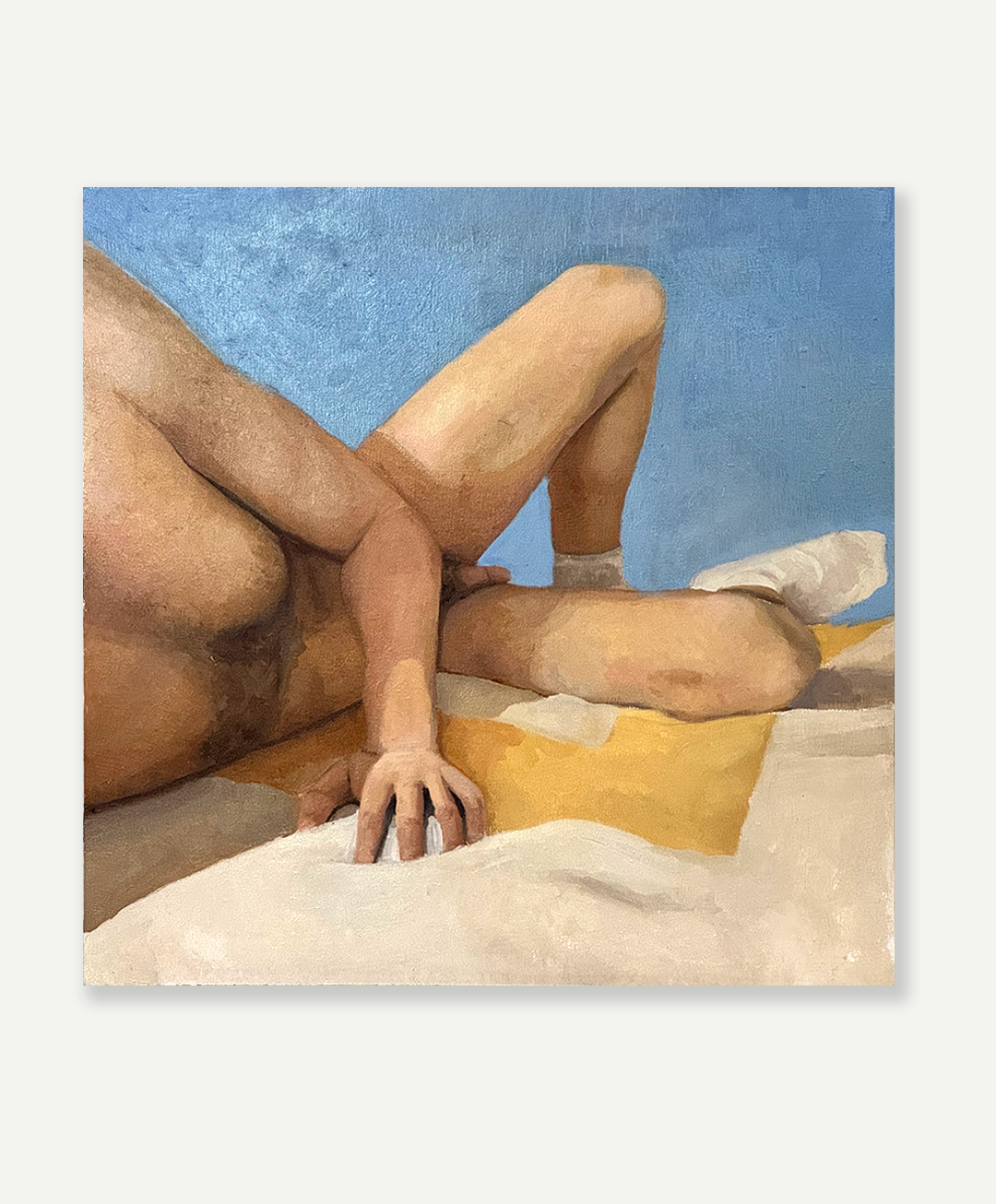 A body at rest that still carries heat. In Reclined, Cole Puetz gives us the soft architecture of a summer afternoon in the Pines: sky-blue ground, towel yellow, the hand pressed into the sheet as if to hold the moment in place. The cropping is tender and decisive—no face, no fuss—just breath, touch, and the warm geometry of skin in light. It’s the Pines without the postcard.