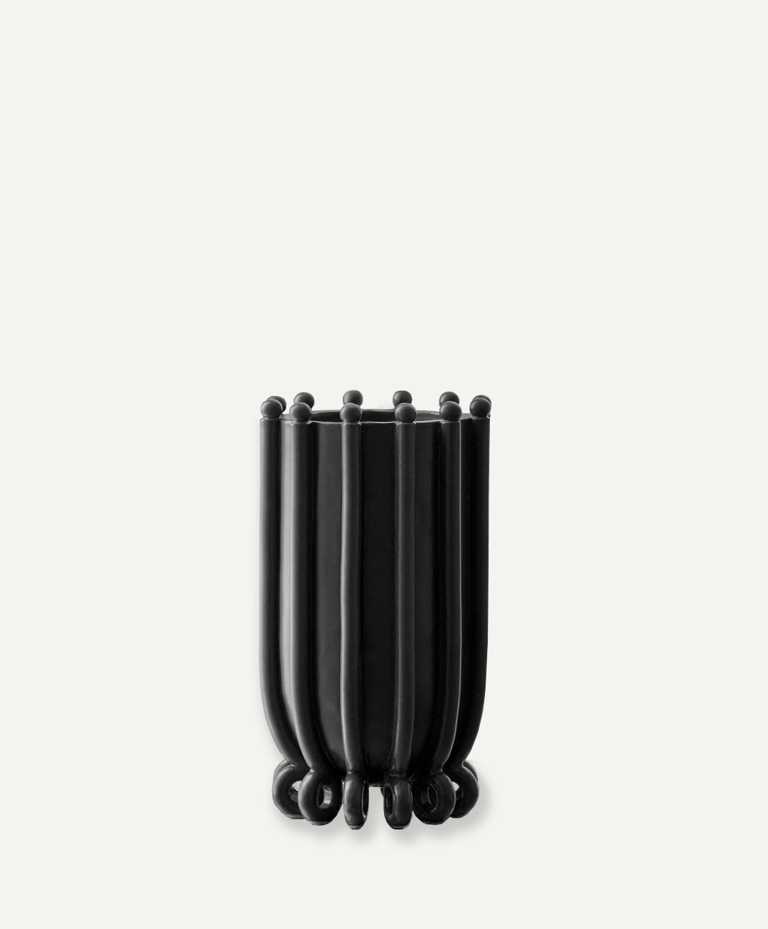 In Vessel No. III, Devin Wilde gathers fluted columns into a dark crown, lifts them on curled feet, and seals the whole form in a onyx-black glaze. It’s moody and elegant—a functional sculpture that can anchor a room, with or without flowers.